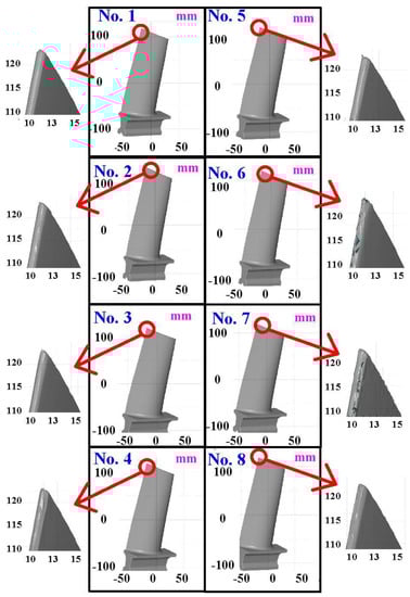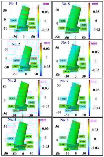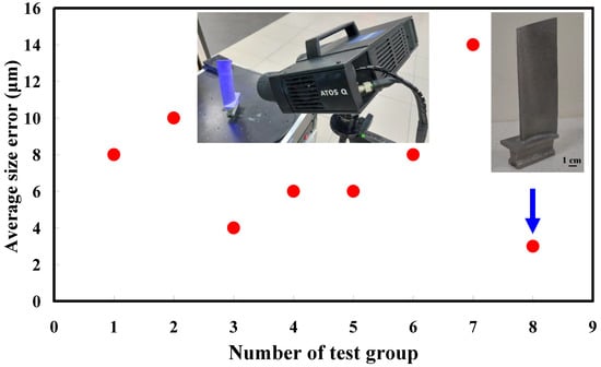 The first measurement object is the as-cast turbine blade having a rough surface. This measurement object is made using the investment casting technique []. Figure 4 shows the measurement results of the as-cast turbine blade that was sprayed with a mixture of ethanol and TiO2 powder before optical measurements. The number of captured points is approximately 156,659 using the high quality function. Figure 5 shows the measurement results of the as-cast turbine blade that was not sprayed with a mixture of ethanol and TiO2 powder. The numbers of captured points for eight different measurement methods are approximately 218,781, 225,113, 212,619, 219,582, 217,377, 224,056, 222,458, and 220,494, respectively. The control group is considered as the nominal model. Figure 6 shows the computer-aided verification (CAV) results of the as-cast turbine blade. Note that the five measurement data shown in the figure are representative analysis results. The color deviation map represents the CAV results compared with the nominal model. Note that the incomplete geometry derived from data omission at the edge of the measurement object was the most serious for the test group numbers 6 and 7. Figure 7 shows average size error of the eight test groups compared to conventional method for the as-cast part. Compared to the overall measurement results from the control group, average size errors of the eight test groups are approximately 8 µm, 10 µm, 4 µm, 6 µm, 6 µm, 8 µm, 14 µm, and 3 µm, respectively. It is understandable that average size error of the 3D optical measurement parameters using number 8 of the test group is the lowest because average size error is only 3 µm. This means that the suggested measurement parameters for the as-cast turbine blade that was not sprayed with anything include two exposure times, more point, full resolution, scan all with reflection detection, and ambient light off.