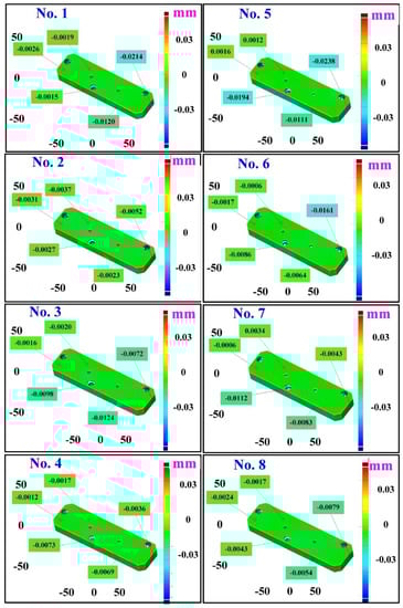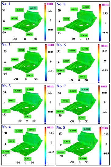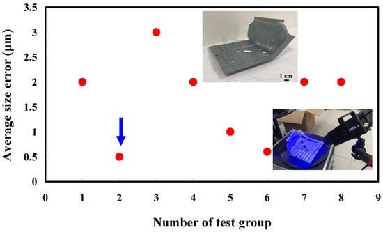 The third measurement object is a glossy sheet metal having a glossy surface. This measurement object is made using the stamping technique []. The characteristic of glossy sheet metal is that the surface of the object does not easily produce reflections. Thus, the reflections can be avoided through different measurement angles in the reflective areas. Figure 12 shows the measurement results of the glossy sheet metal that was sprayed with a mixture of TiO2 powder and ethanol before optical measurements. The number of captured points is about 1,792,675 using high quality function. Figure 13 shows the measurement results of the glossy sheet metal that was not sprayed with a mixture of ethanol and TiO2 powder. The numbers of captured points for eight different measurement methods are approximately 2,308,318, 2,573,995, 2,128,060, 1,922,071, 2,317,219, 2,056,374, 1,981,658, and 2,273,611, respectively. The control group is regarded as the nominal model. Figure 14 shows the CAV results of the glossy sheet metal. The color deviation map represents the CAV results compared with the nominal model. Note that the five measurement data shown in the figure are representative analysis results. Figure 15 shows average size error of the eight test groups compared to conventional method for the glossy sheet metal. Compared to the overall measurement results from the control group, average size errors of the eight test groups are approximately 2 µm, 0.5 µm, 3 µm, 2 µm, 1 µm, 0.6 µm, 2 µm, and 2 µm, respectively. The results showed that average size error is very small and the maximum average size error is only 3 µm. The main reason is that there are a few omissions in all the scanned data. In addition, the average size error of experiment number 2 and experiment number 6 of the test group is less than 1 µm. The main reason is that both experiment methods utilize two exposure times for 3D optical detection. The only difference between the two methods is that the ambient light was turned on in number 2 of the test group. It is obvious that the average size error of the 3D optical measurement parameters using number 2 of the test group is the lowest because the average size error is only 0.5 µm. This means that the suggested measurement parameters for the as-cast turbine blade that was not sprayed with anything involve full resolution, two exposure times, more point, scan all, and reflection detection on.