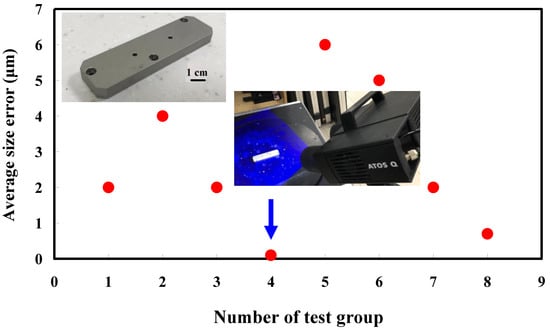 The second measurement object is a cast part after CNC machining []. Especially, this measurement part has a glossy surface. The characteristic of a cast part after CNC machining is that the surface at the corners and edges of the object is relatively smooth. Thus, these places more easily produce reflections. Figure 8 shows the measurement results of the cast part after CNC machining that was sprayed with a mixture of TiO2 powder and ethanol before 3D optical measurement. The number of captured points is approximately 47,334 using the high quality function. Figure 9 shows the measurement results of the cast part after CNC machining that was not sprayed with a mixture of ethanol and TiO2 powder. The numbers of captured points for eight different measurement methods are approximately 89,991, 80,917, 86,748, 86,674, 99,382, 81,020, 85,846, and 77,427, respectively. The control group is considered as the nominal model. The color deviation map represents the CAV results compared with the nominal model. Figure 10 shows the CAV results of the cast part after CNC machining. Figure 11 shows average size error of the eight test groups compared to conventional method for the cast part after CNC machining. Compared to the overall measurement results from the control group, average size errors of the eight test groups are approximately 2 µm, 4 µm, 2 µm, 0.1 µm, 6 µm, 5 µm, 2 µm, and 0.7 µm, respectively. Note that the average size error of experiment number 4 and experiment number 8 of the test group is less than 1 µm. It is evident that the average size error of the 3D optical measurement parameters using number 4 of the test group is the lowest because average size error is only 0.1 µm. This means that the suggested measurement parameters for the as-cast turbine blade that was not sprayed with anything involve full resolution, two exposure times, more point, scan all with reflection detection, and ambient light on.