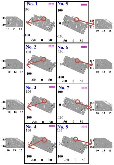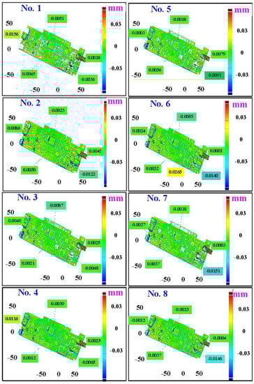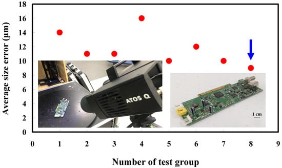 The fourth measurement object is a circuit board [] having uneven surface. Especially, the circuit board has many reflections because there are many electronic components on the surface. Figure 16 shows the measurement results of the circuit board that was sprayed with a mixture of TiO2 powder and ethanol before optical measurements. The number of captured points is approximately 356,560 using the high quality function. Figure 17 shows the measurement results of the circuit board that was not sprayed with a mixture of ethanol and TiO2 powder. The numbers of captured points for eight different measurement methods are approximately 362,830, 384,853, 362,855, 370,602, 311,140, 329,956, 301,302, and 345,667, respectively. Figure 18 shows the CAV results of the circuit board. The color deviation map represents the CAV results compared with the nominal model. Note that the incomplete geometry derived from data omission at the edge of the measurement object was the most serious for the test group numbers 1, 3, 5, and 7. The main reason is that these four methods use one exposure time. The control group is considered as the nominal model and the color deviation map stands for the measurement results deviated from the nominal model. Figure 19 shows average size error of the eight test groups compared to conventional method for the circuit board. Compared to the overall measurement results from the control group, the average size errors of the eight test groups are approximately 14 µm, 11 µm, 11 µm, 16 µm, 10 µm, 12 µm, 10 µm, and 9 µm, respectively. It is obvious that the average size error of the 3D optical measurement parameters using number 8 of the test group is the lowest because the average size error is only 9 µm. This means that the suggested measurement parameters for the as-cast turbine blade that was not sprayed with anything involve full resolution, more point, two exposure times, scan all with reflection detection, and ambient light off.