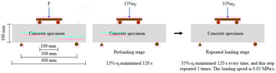 The new rapid F-T test method of simulating load and F-T coupling test was adopted [31]. The flexural stress level used in the test is 35% ultimate flexural strength (σf). Under this stress condition, the microcracks are stable. The specific loading procedure is shown in Figure 1. The specific application process is as follows: