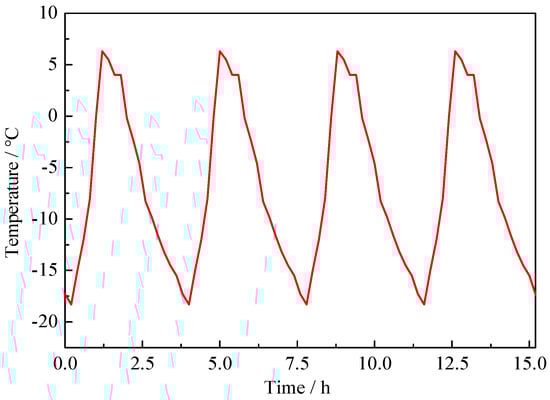 The new method avoids stress loss due to the violent fluctuation of the rapid F-T test temperature. The mechanical properties and rapid F-T test of NAC were carried out according to GB/T 50081(2019) [32] and GB/T 50082(2009) [33] respectively. The temperature variation is shown in Figure 2, the temperature range is −18 ± 2~5 ± 2 °C. The mass loss rate (MLR) and relative dynamic modulus of elasticity (RDME) were tested every F-T 50 cycles, the calculation formulas are shown in Formulas (1) and (2) respectively. The fc and ff were tested every F-T 150 cycles.