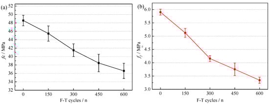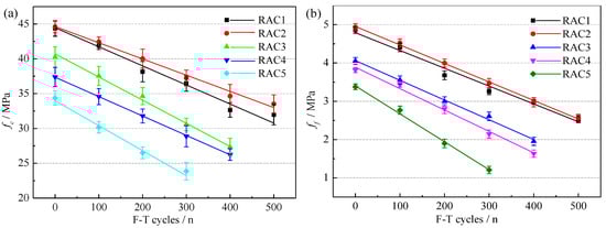 Figure 9 shows the variations of fc and ff of RAC-i. It can be found that the fc and ff of RACs decreased linearly with the increase of F-T cycles. In Figure 9, it is expected that RAC5 had the worst mechanical properties. It was caused by the difference in the physical properties of RCA.
