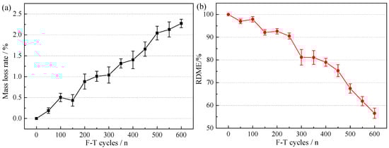 The variations of MLR and RDME of NAC after F-T cycles are illustrated in Figure 5a,b, respectively. In Figure 5, the MLR of NAC increased gradually with the increasing F-T cycles, and the RDME decreased with the increasing F-T cycles. Although the MLR of NAC was less than 5% after F-T 600 cycles, the RDME of NAC was less than 60%. It indicated that the surface and internal structure of NAC were damaged to varying degrees. The water frozen at a low temperature of NAC internal volume increased by about 9%, which exerted expansion stress on the capillary walls inside concrete [38]. When the swelling stress is greater than the tensile strength of the capillary wall, microcracks and internal structure damage occurred, leading to concrete degeneration, fragile until the fracture collapse. Therefore, it was more reasonable to quantify F-T damage by RDME.