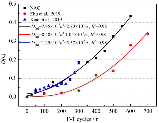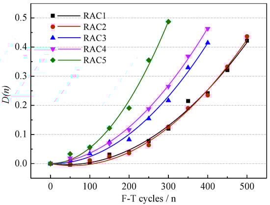 According to Formula (9), the F-T damage D(n) under different F-T cycles was obtained [39]. The variation of F-T damage of NAC is shown in Figure 6. The F-T damage increased rapidly with the F-T cycles, which indicated that the internal structure of NAC was seriously damaged. A quadratic function is a common fitting method between F-T damage and the number of F-T cycles [40,41,42]. The fitting formula is shown in Formula (10).