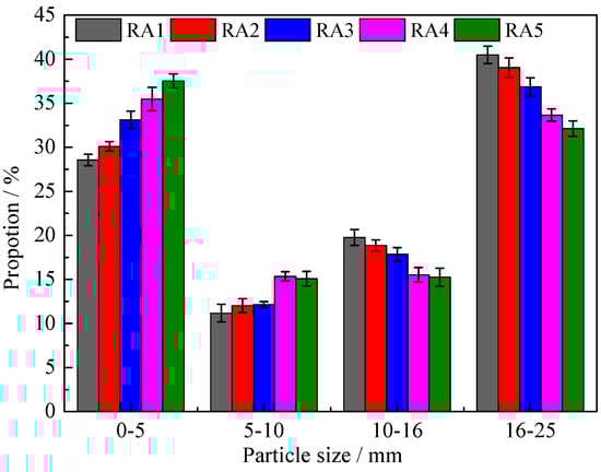 The particle size proportions of recycled aggregate (RA) are shown in Figure 7. Each RA was randomly selected for screening three times, and at least 5 kg was weighed each time. The average value and error were calculated. The RA-i was obtained from the NAC every F-T 150 cycles until F-T failure. As the F-T cycles of NAC increased, the particle size proportion of 0–5 mm of RA increased and the proportion of RCA with particle size greater than 5 mm decreased.
