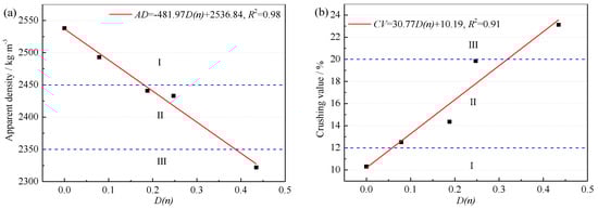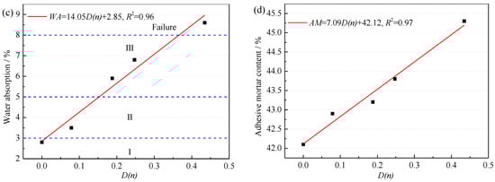The F-T damage had the greatest impact on water absorption index by comparing various physical properties. Therefore, the fitting equation of water absorption and F-T damage of NAC was established, as shown in Formula (12). GB/T 25177(2010) [34] specifies the maximum water absorption of RCA for structural concrete is 8%. This value can be substituted into Formula (12), and D(n) can be inversely calculated as 0.367. It suggested that the F-T damage threshold of RCA as structural concrete coarse aggregate is 0.367.