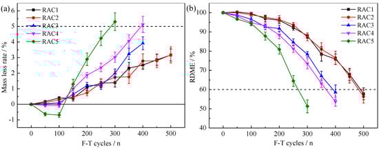 The variations of MLR and RDME of RAC-i are shown in Figure 10. F-T failure occurred in RAC1, RAC2, RAC3, RAC4 and RAC5 after F-T 500, 500, 400, 400 and 300 cycles respectively. Obviously, RAC1 and RAC2 had better frost resistance, followed by RAC3 and RAC4, and RAC5 was the worst. The F-T damage of parent concrete had an adverse impact on the frost resistance of RAC. When the F-T damage of parent concrete was more serious, the frost resistance of RAC was worse.