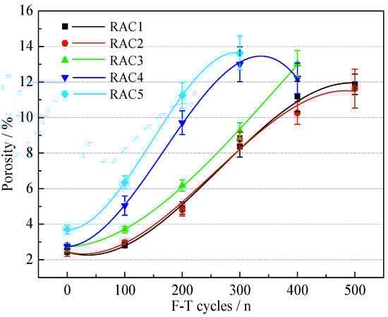 The variations of the porosity of RAC are shown in Figure 12. The porosity of all five RACs increased with increasing F-T cycles, which was similar to previous studies [47]. In the early F-T period, the porosity of RACs increased slowly. The addition of AEA optimized the pore structure of RAC, which can relieve the expansion stress caused by free water freezing in the early F-T period, and thus effectively resist the destruction of pore structure caused by F-T damage [21]. In the middle F-T period, with the development of F-T cycles, harmless pores gradually became harmful pores, resulting in a rapid increase in porosity, which indicated that the internal structure of RACs was seriously damaged. In the late F-T period, the growth of porosity became slow, and the porosity of RAC4 showed significant negative growth. This was due to the collapse of the pore wall caused by the expansion of the large pores to the limit, and the peeling mortar-filled part of the large pores [48].