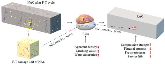 The influence mechanism of NAC F-T damage on the mechanical and frost resistance of RAC is shown in Figure 14. Plenty of pores and microcracks were produced after NAC F-T cycling, and some parts of NAC could be regarded as microelements of F-T damage. After the broken of NAC, the damaged microelement dispersed in the adhesive mortar of RCA, resulting in the decline of the physical properties. When RCA was used to prepare RAC, these microelements were transferred again, which caused worse internal structure in RAC, and ultimately led to the macroscopic properties of RAC decreasing. There was no doubt that the adhesive mortar of RCA played an important role in the intergenerational transfer of NAC F-T damage.