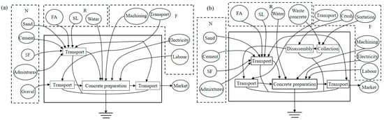 Emergy analysis is an effective method to evaluate the sustainability of renewable resource recovery systems [23]. Based on natural value, this method converts various natural and social economic resources into solar energy values for research, and converts materials, energy, and information of different qualities into a dimensionally unified energy value—solar joules, thus realizing the docking of ecological flow and economic flow [24]. Yuan et al. [25] pointed out the closed-loop recycling of construction waste was better than open-loop recycling from three aspects of society, environment, and sustainability based on the emergy theory. Zhao et al. [26] believed that the emergy sustainability index (ESI) value of circular economy concrete production mode was greater than that of traditional NAC, and the circular economy concrete production was more sustainable. Introducing emergy theory into RAC production in the F-T environment will provide theoretical support for the application of RAC and sustainable development of the construction industry.