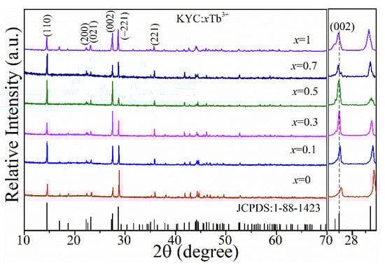 X-ray diffraction spectra of KYC:xTb3+ (x = 0, 0.1, 0.3, 0.5, 0.7, 1).