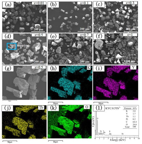 The morphologies of KYC:xTb3+ at different x values are shown in Figure 2. When x value was 0.01, the phosphor exhibited as a single monoclinic particle with a size of 40–60 μm in Figure 2a. With the increase in Tb3+ ion concentration, the growth rate of the nucleus was obviously accelerated. Small monoclinic crystal particles aggregated with each other to form a large particle (Figure 2b–d). When the x further increased to 0.7 and 1, individual grains grew larger and easily fractured into small pieces (Figure 2e–f). A small area was selected from Figure 2d, and energy dispersive spectroscopy of Figure 2g was taken to demonstrate the existence of K, Y, Tb, and O elements in Figure 2h–l. From the element distribution maps, K, Y, and Tb ions were well-dispersed in KYC:0.5Tb3+. The relative elemental composition was close to the original stoichiometric ratio.