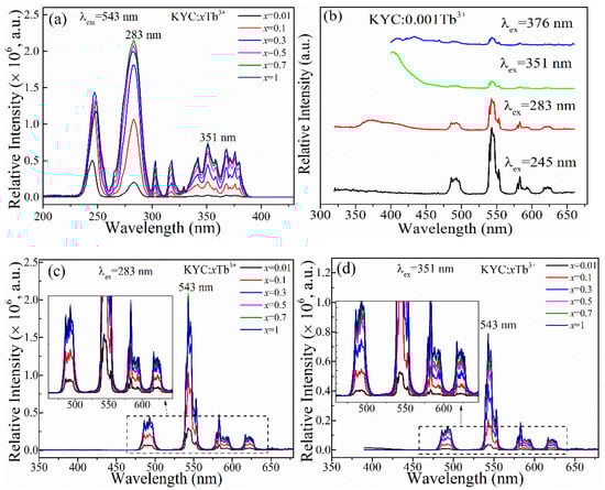 Luminescence spectra of KYC:xTb3+: (a) excitation spectra; (b) emission spectra of KYC:0.001Tb3+; (c) emission spectra excited at 283 nm; (d) emission spectra excited at 351 nm.