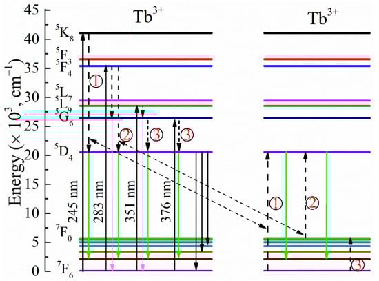 Figure 4 gives a schematic diagram of the electron transition on the excited-state energy level of Tb3+. As can be seen from the diagram, electrons at the 7F6 level were excited to the 5K8 level by the 245 nm excitation light. The energy levels 5K8, 5F4, 5D4, 7F0, and 7F6 of Tb3+ were at 40,749, 35,380, 20,545, 5703, and 74 cm−1, respectively []. The 5K8→5D4 energy gap of 20204 cm−1 was similar to that of 7F6→5D4 (20471 cm−1). The excited-state electrons could transfer energy directly to the 5D4 level by the cross-relation: 5K8 + 7F6→5D4 + 5D4 (process 1), and then, the two excited-state electrons transferred back to the 7FJ (J=6, 5, 4, 3) for the quantum cutting emission at 493, 543, 583, and 623 nm, respectively. Under the excitation at 283 nm, the ground-state electrons of 7F6 were excited to the 5F4 level []. Then, the excited-state electrons returned to the two lower excited states 5G6 and 5D4. A proportion of excited-state electrons could transfer in a way of 5F4 and 5G6 to 7FJ with a board emission (360–420 nm), which is clearly shown in Figure 3b. It is worthwhile to note that the energy gaps were almost the same between 5F4→5D4 (14835 cm−1) and 7F0→5D4 (14842 cm−1). The other proportions of excited-state electrons could more easily return to 5D4 with the cross-relation: 5F4 + 7F0→5D4 + 5D4 (process 2). Finally, two excited-state electrons of 5D4 transferred to 7FJ in a quantum cutting emission. Under the excitation of 351 nm, the excited electrons at the 5L9 level could return to the 5G6 level through vibration relaxation and then transfer to 7FJ with the board emission, which is shown in Figure 3b. The other electrons returned to 5D4 with the cross-relation between 5G6→5D4 and 7F6→7F0, and the visible light could be emitted for the transition from 5D4 to 7FJ, which was the same as the excitation process of 376 nm.