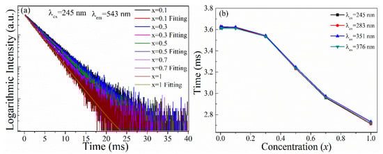 Figure 5a shows the luminescence decay curves at different Tb3+ concentrations in KYC:xTb3+. As can be seen from the figure, the decay curves for different concentrations of KYC:xTb3+ could be single exponential for the emission process. It was indicated that the excitation electrons of 5D4 state have a longer lifetime than those of the 5K8 level. As the doping level increased, the cross-relaxation between the two Tb3+ became more intense, and the excited-state electrons decayed faster. The variation in lifetime as a function of x is shown in Figure 5b. It is seen that the lifetime of 543 nm green light decreased with the increase in Tb3+ content. The variation in lifetime was small when x was less than 0.1. When x was increased, the green emission lifetime at 543 nm decreased rapidly, which indicated that there is a faster energy migration process between the two Tb3+ ions in the crystal lattice of KYC. The fast migration process of excited-state electrons enables KYC:Tb3+ to be an efficient green-light-emitting phosphor.