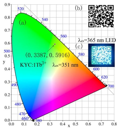 Quick response (QR) code is widely used in our life for information identification, health codes, trademark and product introduction, and so on. A highly efficient phosphor could enhance the QR code recognition in poor lighting conditions. Figure 6 shows the application of information identification for the luminescent QR code of KYC:1Tb3+ under the 365 nm LED irradiation. The chromaticity coordinate is (0.3387, 0.5916) in Figure 6a. The point position of KYC:1Tb3+ phosphor is in green field. Compared to a common QR code (Figure 6b), the luminescent QR code could be more easily identified in the darkness. Moreover, we can use QR codes to store some information or product introduction, especially in places where the space is small but where a lot of information needs to be expressed. The extended information can be easily obtained by scanning a QR code with a mobile phone in Figure 6c, such as “Huaibei Normal University”. In addition, the information can be kept secret by hiding the QR code under the transparent surface of a product. When information needs to be viewed, the QR code is displayed by ultraviolet excitation.