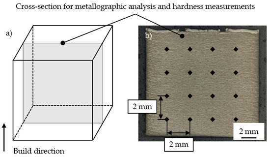 Experimental approach for (a) sample preparation for analysis of the relative part density and hardness measurements and (b) measurement pattern for determining the material hardness.
