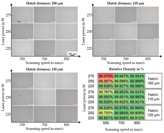 The AconityMINI system was used for identifying the potential process window. Due to the small build envelope, screening investigations can be performed already for low amounts of powder. Three different hatch distances (100, 110, and 120 µm) were studied for three different laser powers (225, 250, and 275 W) and three different scanning speeds (550, 700, and 850 mm/s). In each build job, five samples were manufactured. Figure 3 presents the results on the relative part density for the investigated parameter window. A larger representation of the different cross-sections can be found in Appendix A (Figure A1, Figure A2 and Figure A3).