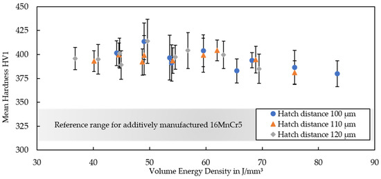 Bainidur AM is characterized by a homogeneous material hardness over a wide range of parameters. The trend indicates that the material hardness decreases for increasing VEDs exceeding 70 J/mm3. This appears logical, as higher VEDs—often due to lower scanning speeds or higher laser powers—typically result in a coarser microstructure compared to lower VEDs [25]. Furthermore, these samples possess a higher porosity, which was caused by overheating and keyhole formation during build-up. Apart from the highest VEDs, the material hardness remains constant for a wide parameter window, which can be helpful when manufacturing larger parts in the future to avoid a geometry-specific overheating. The hardness surpasses that of additively manufactured 16MnCr5 by up to 70 HV1 on average [15,16], showing the enormous potential of the low-alloyed steel Bainidur AM for the manufacturing of construction parts. This improved hardness can at least be partially explained by the higher carbon content of Bainidur AM. Apart from that, no significant differences between the specimens could be observed and all specimens were characterized by a continuous and homogeneous hardness in the build direction.