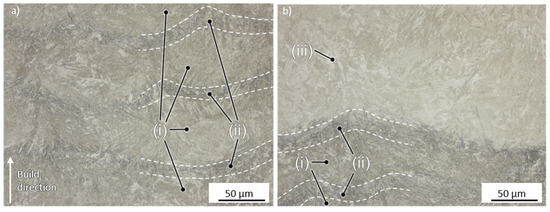 Different microstructural regions of PBF-LB/M specimens (a) in the core with the fusion zone (i) and heat-affected zone (ii) and (b) in case (iii), manufactured using a medium VED of 54.1 J/mm3.