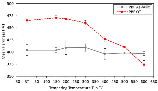 The as-built and tempered samples possess finely dispersed carbides within the grains at all temperatures. These carbides can be the reason for the good thermal stability of the as-built specimens. At a tempering temperature of 600 °C, however, these carbide structures are harder to identify and barely present. Mohr et al. [34] have found the global temperatures at the surface of the specimen to fall below 250 °C for 10 mm specimens within their work (see Figure 4 in [34]). Thus, it is unlikely that the underlying microstructure is a tempered martensitic one, as a hardness drop-off would be expected when exceeding the process-specific temperature (in this case approximately 250 °C). Fine carbides can also be identified in the hardened (and tempered) specimens. However, these specimens were characterized by a hardness drop-off, which is typically observed when tempering martensite. It is therefore more likely that a bainitic microstructure is underlying in the as-built state, despite the optical similarities in the as-built and quenched states.