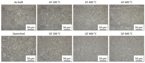The QT specimens possess the highest material hardness (470 HV1) at room temperature. Increasing the tempering temperature results in a hardness decrease, a common effect observed for tempered martensite in low-alloyed steels [29]. The corresponding material hardness falls as low as 370 HV for the highest tempering temperature of 600 °C. In contrast, as-built and tempered specimens possess a homogeneous material hardness of 405 HV1 at all temperatures. This indicates that a primarily bainitic microstructure is present after manufacturing. Santajuana et al. [30] and Peet et al. [31] have both found a similar high-temperature stability of bainite up to tempering temperatures of approximately 500 °C for steels with a higher carbon content. The work by Kafadar et al. [32] also indicates that the alloying elements, especially molybdenum, significantly affect the tempering stability. Sourmail et al. [33] report similar findings on the effect of vanadium. As both these alloying elements are present in the material Bainidur AM, it can be expected that these alloys result in carbide formation during cooling. Figure 10 presents images of the corresponding etched cross-sections after the respective tempering heat treatment.