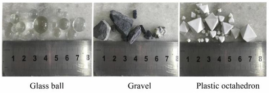 The experimental materials were blasted gravels from the Shuibuya Dam yard in China, which blasts limestone fragments. They were sieved and washed to remove impurities and dust before being studied. Glass balls and plastic octahedrons were selected for comparison to reduce the workload when artificially measuring the physical dimensions. Since there is no seepage deformation involved in low-head permeability tests, the different materials did not affect the test results. The sample particle sizes ranged from 2 mm to 20 mm to diminish the size effect on the test results. The materials are shown in Figure 1.
