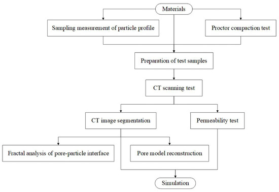 Figure 2 depicts the experiment flow of this study. First, we manually sampled the gravel and measured the shape. The proctor compaction test examined the materials’ maximum and minimum dry density. Then, we designed the particle size distribution and porosity of laboratory test samples according to the particle size distribution of the sampled gravel and the dry density range. Table 1 shows nine test samples, and the shape was the only variable factor. Test samples were prepared as described in Table 1 and were used to fill a permeameter in three layers of the same thickness for homogenization. The permeameter was a plastic cylinder with an inner diameter of 10 cm. The lower water inlet chamber was fitted with a connecting pipe for the pressure measuring tube, and the top was fitted with an overflow pipe. The filling height of the sample was 7 cm, which was more than three times the maximum particle size, to eliminate the effect of size on the results. Next, the CT scanning test was conducted on the samples to obtain their pore structures, and the permeability test was carried out on the samples to study their hydraulic conductivities. We segmented the CT scanning test results to extract the samples’ pores for fractal analysis and three-dimensional model reconstruction. Finally, the permeability test was simulated two-dimensionally based on the CT images.