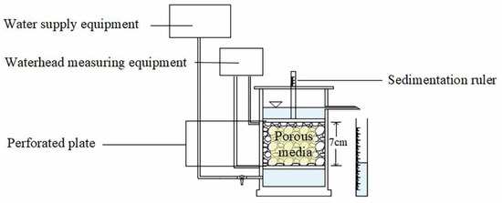 The constant-head permeability test was performed on particle packs after scanning. The test used boiled purified water to eliminate the influence of bubbles. The sample packs were soaked for more than 2 h to saturate entirely before conducting the permeability test. The test flow direction was from the bottom to the top, and the overflow nozzle controlled the downstream waterhead (Figure 3). The waterhead of the water tank was gradually raised to provide a 0.05 hydraulic gradient with a waiting period of 10–20 min for each step. The upstream and downstream waterhead values were recorded, and the flow of the overflow pipe was measured over time with a measuring cylinder. The following hydraulic gradient of the permeability test was conducted as long as the flow measured the same values three consecutive times. In each test, the pack had no seepage deformation, and the sedimentation value measured at the top of the sample was maintained at 0.