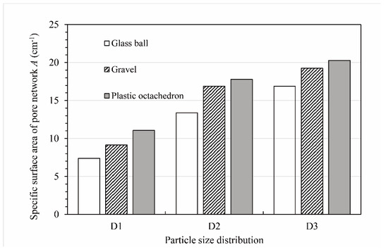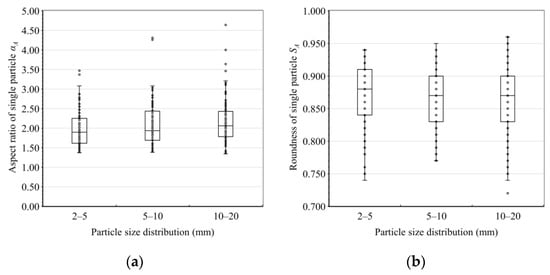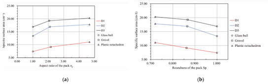 Because the particle size distribution of the test samples was obtained by multiplying the particle content of the sampled particle size distributions of 2–5 mm, 5–10 mm, and 10–20 mm by the percentage in Table 2, the aspect ratio of a particle pack (αP) was equal to the sum of αA for each particle size distribution multiplied by the percentage in Table 2. Similarly, the roundness of a particle pack (Sp) was equal to the sum of SA for each particle size distribution multiplied by the percentage from Table 2. The particle shape parameters of the glass ball pack and plastic octahedron pack were fixed values that were independent of the size distribution.