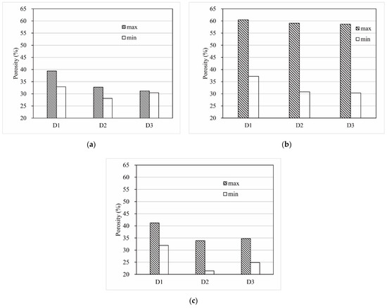 Figure 8 depicts the maximum and minimum porosities of the samples with D1, D2, and D3 particle size distributions according to the results of the proctor compaction test. As can be seen from the bar graphs, the porosity range variation was the most significant for gravels and the most minor for glass balls for the same particle size distribution. Therefore, the porosity of packs should be determined using the glass balls’ porosity range. The porosities of the samples in D1, D2, and D3 were set to 38.81% (P1), 32.29% (P2), and 31.22% (P3), respectively.