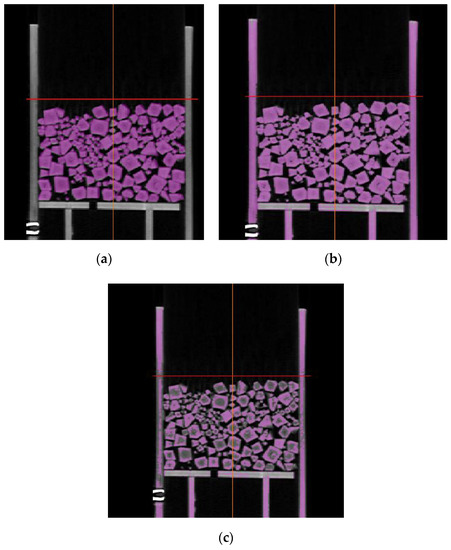 There is currently no standard for verifying the validity of image segmentation results. The outline of the segmented target can only be observed by the human eye to see whether it is clear and complete. The accuracy of calculating the pore–particle interface’s fractal dimension and the pore surface area depends entirely on the accuracy of the image segmentation. Therefore, we verified the validity of the SVM by comparing the segmentation results of the same CT image using SVM, the gray-scale morphology method [55], and the histogram method [56]. Gray-scale morphology and histogram segmentation are common segmentation methods. Figure 10 shows the comparison of O1′s CT image segmentation result. Among the three materials, the CT image segmentation of plastic octahedrons was the most difficult because of its non-uniform color in the CT images due to the uneven particle density. The plastic particles had a high density at the edges and a low density in the middle, which could not be avoided when manufacturing due to their pouring process. In addition to the problem of the non-uniform density of plastic particles, the densities of the plastic particles and the resin permeameter were close, which was also an obstacle. In Figure 10, purple represents the particles segmented from the image. The original CT image was used as the background to discriminate the segmentation effect. The gray-scale morphology method could not separate the particles from the permeameter in the CT image of O1, according to Figure 10b. Using the histogram method not only failed to separate the particles from the permeameter but also over-divided the particles in the same image, according to Figure 10c. This showed that the SVM method segmented the CT image of O1 with significantly better results than the other two methods. SVM had advantages when segmenting the same heterogeneous object or different objects with similar densities.