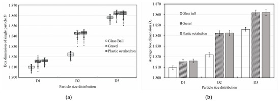 Box dimensions of the pore–particle interfaces. (a) The box plot of the box dimensions of single particles’ pore–particle interfaces. (b) The bar graph of the packs’ average box dimensions. The figure’s error lines were based on the standard deviation.