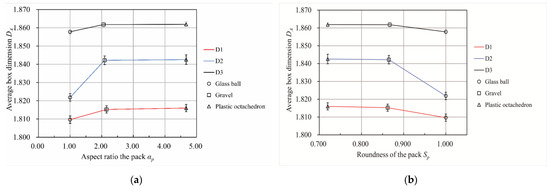 The relationship between the particle pack shape and the average box dimension of the pore–particle interfaces. The error lines in the figures were based on the standard deviation. (a) The relationship between the average box dimension of the pore–particle interface and the aspect ratio of the packs. (b) The relationship between the average box dimension of the pore–particle interface and the roundness of the packs.