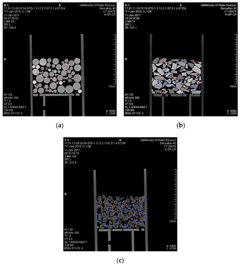 The CT scanning test was performed on particle packs contained in the permeameter, which was a high-spatial-resolution Siemens 40 CT machine from Changjiang River Scientific Research Institute, to observe the internal pore structure. The image reconstruction matrix was 512 × 512, and the minimum spatial resolution was 0.29 mm.