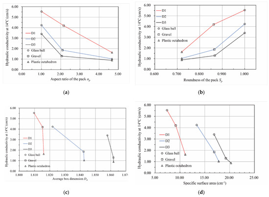 - A gravel pack with a larger aspect ratio and smaller roundness had a larger box dimension associated with its pore–particle interface and a greater specific surface area of the pore network, which meant it had a more complex pore structure. The content of particles less than 5 mm affected the relationship between the shape factor, pore–particle interface, and specific surface area of the pore network. The influence degree of particle shape was dependent upon the content of fine particles.