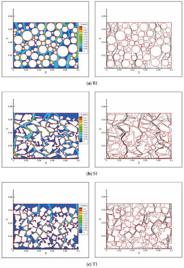 The streamline is a curve that is tangent to the velocity vector at every point in the flow field, while the trace is the curve depicted by the fluid mass as it moves through space. For a constant flow, the streamline and trace coincide. Therefore, as long as the tortuosity of the streamline is calculated, the tortuosity of the trace is obtained. The number of seed points for all simulation results that generated the streamlines was set to 10. The tortuosity (τ) is an important parameter that describes the seepage channels. It is defined as the actual length of the seepage channel and the apparent length through the samples; that is, it is the exact length of the water’s motion track in the channel when the permeate water passes through a unit distance of a pack: