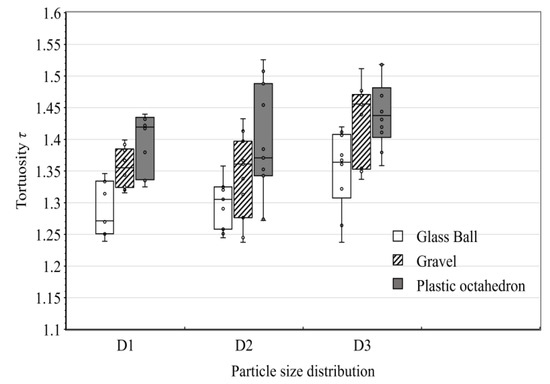 where Lt is the length of the curved line and Lo is the length of the line along the direction of the hydraulic gradient. Figure 20 depicts the statistical results of the tortuosity of the traces of all models. According to the box plot, for the same particle size distribution, the τ of the ball pack was the smallest and that of the octahedron pack was the largest. The greater the tortuosity, the longer the actual path of water flow, and the macroscopic results were that the cross-section flow of porous media decreased and the permeability decreased over time. The same material pack had the smallest τ for D1 and the largest τ for D3, which is consistent with the law of hydraulic conductivity. The distribution of τ was not uniform because the two-dimensional simulation of the seepage field had limitations. Since a three-dimensional porous media pore network model is too complex in space to mesh appropriately, we only simulated the laboratory test in two dimensions. Although the τ in Figure 20 does not represent the actual tortuosity of the water path of porous media in the laboratory test, our two-dimensional simulation was based on the CT images of the packs, and the pore structure in the model was the same as the actual pore structure. The characteristic of the flow field is convincing.