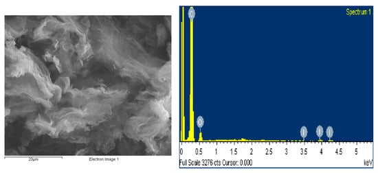 SEM microstructure and energy dispersive X-ray spectroscopy spectrum of prepared I-doped graphene oxide.