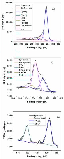 Figure 2 shows the high-resolution survey scanning of iodine orbitals (I3d5/2 and I3d3/2) in the 616–635 eV interval. Table 2 summarizes the results obtained from functions fitting after the background subtraction. The presence of over 75% sp2 hybridized C–C bonds certifies the efficaciousness of the graphene oxide matrix reduction. The C–C bonds are dominant since the HI acid reduction occurred, because most of the hydroxyl and epoxy groups were removed. However, some oxygen-containing functional groups still remain in the rGO sheets, which are typical for chemically reduced GO. The elemental composition and iodine bonding types were investigated. As presented in Figure 2, the C1s (~284.5 eV) and O1s (~533.7 eV) peaks are clearly observed in the XPS spectra of prepared I/rGO. The corresponding iodine peaks were easily noticed in the high-resolution XPS of I3d (Figure 2c), which can be caused by iodine’s doping concentration of approximately 0.13 atomic%. The presence of I3d peaks at I3d5/2 (~618.8 eV) and I3d3/2 (~631.3 eV), respectively, suggests the enhancement of the iodine interaction with the graphene oxide matrix. The deconvoluted I3d5/2 peak shows two peaks: first is the 617.96 eV peak of triodide (I3−), and the second is 620.21 eV corresponding to pentaiodide (I5−). These results are the same with the one reported in literature []. The first peak is attributed to the iodine anions from an excess of HI and the second peak is assigned to the introduction of iodine into the GO substrate reduced by HI. These obtained results revealed that iodine atoms were efficiently embodied into the graphene matrix and the I3− and I5− remained on its surface after the microwave process. According to chemical composition calculated through this method, the iodine concentration of 1.3 wt.% was obtained.