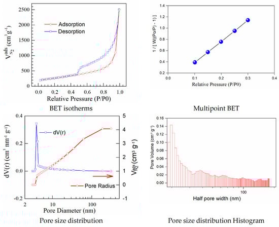 Both adsorption–desorption isotherms present a typical behavior for a mesoporous structure with a uniform pore size distribution, suggesting that the prepared materials have good transport properties among micropores, mesoporous, and macro-porous channels. The calculated specific surfaces and the estimated textural properties for the pore volumes are presented in Table 3.