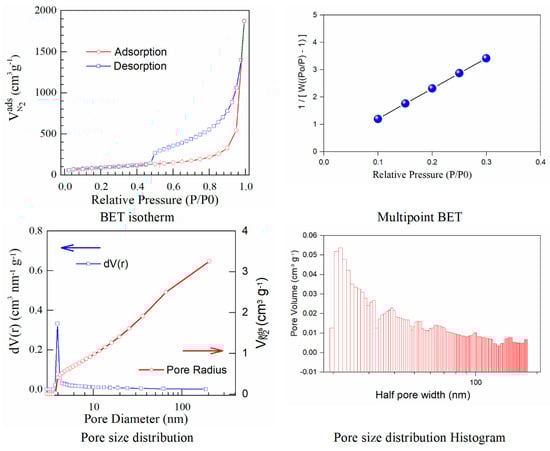The results calculated using the isotherms for adsorption/desorption are presented in Figure 3 and Figure 4. The N2 adsorption/desorption isotherms for both samples correspond to the type IV isotherm according to the specifications from IUPAC. The micropore volume was calculated in the low-pressure region, as the intercept with the adsorbed amount axis represents the volume adsorbed in micropores. It is important to note the excellent linearity starting from the lowest adsorbed amount and also the correlation coefficient R2 very close to one, both indicating a well-defined monolayer and constituting the indicative for the BET data validity.