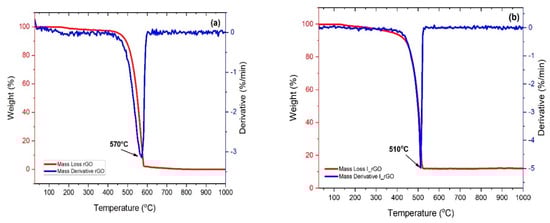 The thermal decomposition curves of the reduced graphene and iodine-doped reduced graphene are presented in Figure 5a,b. Both samples present one decomposition step assigned to the reduced graphene degradation. The I/rGO mass loss is not complete (approximately 86%) and starts at approximately 300 °C, in comparison with the rGO complete decomposition that starts at 400 °C. The 16% of undecomposed I/rGO represents the amount of remanent mass of iodine that has a 2446 °C melting point, lower that the temperature range used for the TGA measurements. From the first derivative mass loss (DTG) it can be observed that the I/rGO decomposition temperature is 510 °C, which is 60 °C lower than the undoped reduced graphene oxide, which is due to the partial breaking of C–I bonds.