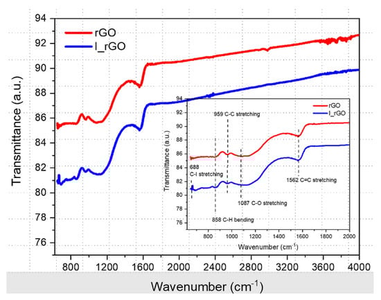 Figure 6 shows the overlapped ATR-FTIR rGO and I/rGO samples’ spectra, with the fingerprint zone in the inset. Both spectra exhibit the common C=C, C−C, and C−O stretching vibrations and C–H bending vibration assigned to 1562, 1087, 959, and 858 cm−1, respectively. Iodine presence in the I/rGO structure can be noticed from the band at C–I assigned to the C−I stretching vibration.