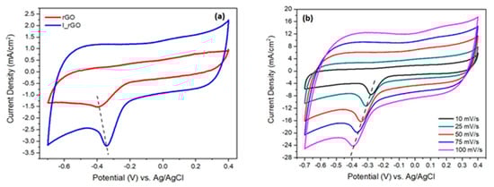 (a) Cycling voltammograms of reduced graphene oxide (rGO) and iodine−doped rGO (I/rGO) recorded between 0.4–0.7 V vs. Ag/AgCl, in oxygen atmosphere, scanned with 50 mV/s; (b) cycling voltammograms of I/rGO at different sweeping rates.