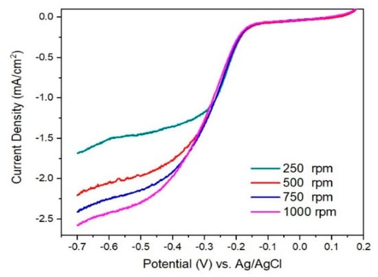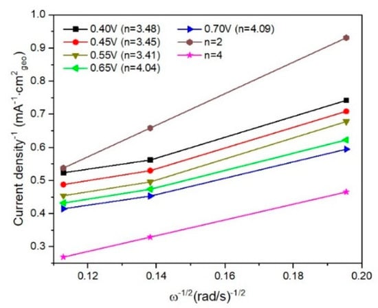 In order to calculate the number of electrons (n) transferred during the ORR process, linear sweep voltammograms were recorded with 5 mV/s, between 0.4 V and −0.7 V and at various rotation speeds (ω) (among 250–1000 rpm). Linear sweep voltammetry (LSV) curves for I/rGO were plotted as j, which is the measured current density (mA−1 cm2geo) vs. ω−1/2 (rad s−1)−1/2 and studied following Koutecky–Levich (KL) Equations (1)–(3) [,,].