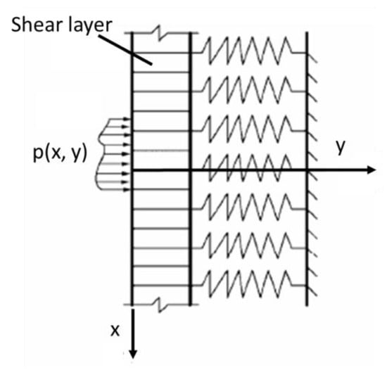 Based on the Winkler foundation model, the Pasternak foundation model assumes that there is a shear layer on the spring element, and this layer can only produce shear deformation but not compressible deformation, so that there is shear interaction between the spring elements, as shown in Figure 1.