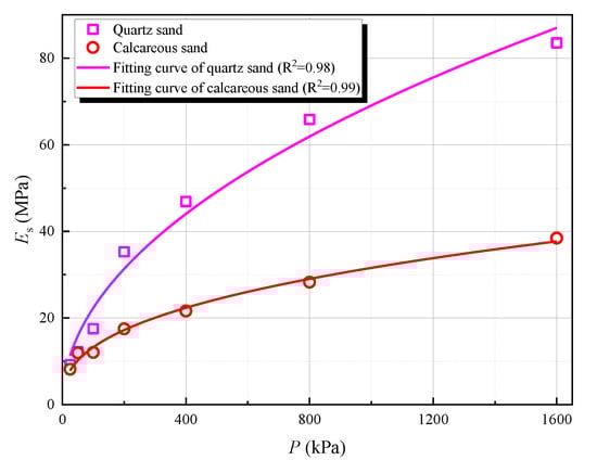 Through the triaxial tests of quartz sand, a certain correlation between quartz sand compression modulus and confining pressure was also observed, as shown in Figure 4. In this experiment, the weight of quartz sand is 18.2 kN/m3, and the static earth pressure coefficient is 0.5. Through insight curve fitting, the relationship between the compressive modulus and the confining pressure of quartz sand can be obtained as follows: