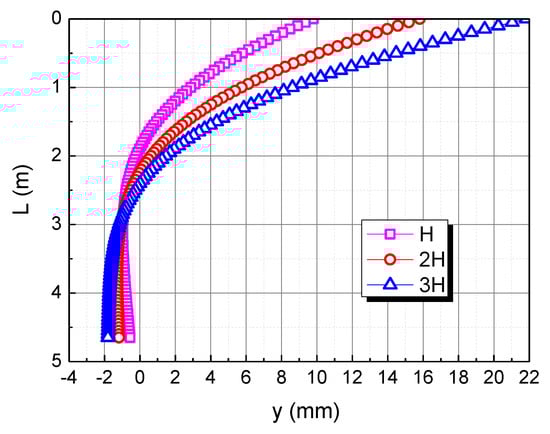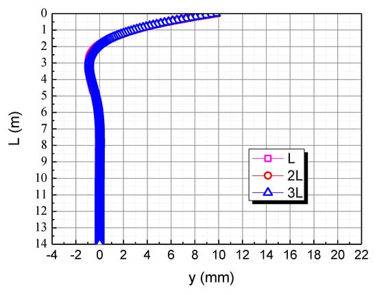 The pile length is taken as L, 2L, and 3L, respectively, to assess the effect of pile length on the horizontal deformation in the calcareous sand area, as shown in Figure 6. As can be seen, the horizontal displacement of the pile body of piles almost coincides, and the maximum displacement is near the pile top; there is a certain negative displacement near 1.9 m~6.6 m, and the horizontal displacement of the pile body beyond 6.6 m is almost 0. Therefore, it is evident that the horizontal load and the bending moment have the most obvious effect on the pile top. However, after exceeding a certain depth, these will no longer affect the horizontal displacement of the pile body. The main reason is that when the burial depth is large, the calcareous sand restricts the displacement of the pile body, so the displacement is almost 0. The application of the pile top load makes the pile top displacement larger. Due to the bottom of the pile being constrained, negative displacement occurs at a certain position below the pile top.
